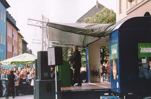 Im Rahmen des Bundestagswahlkampfes der Grünen im September 2002 spricht Joschka Fischer in Witten auf der blau-gelben Bühne.