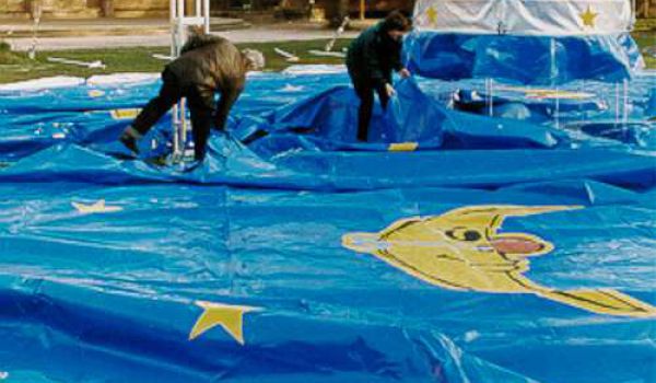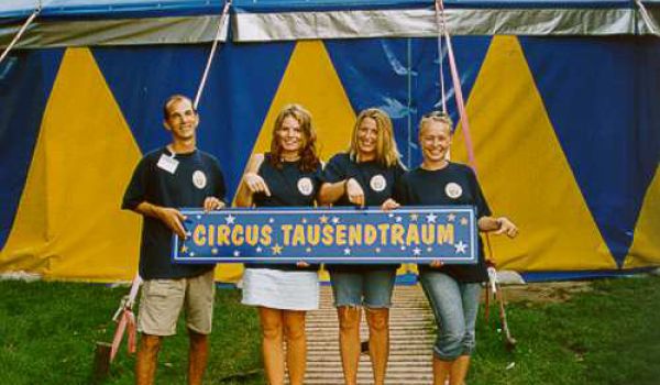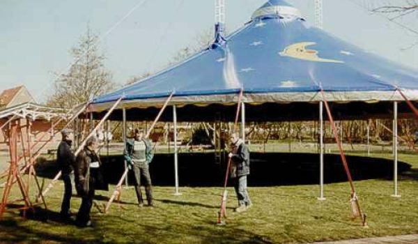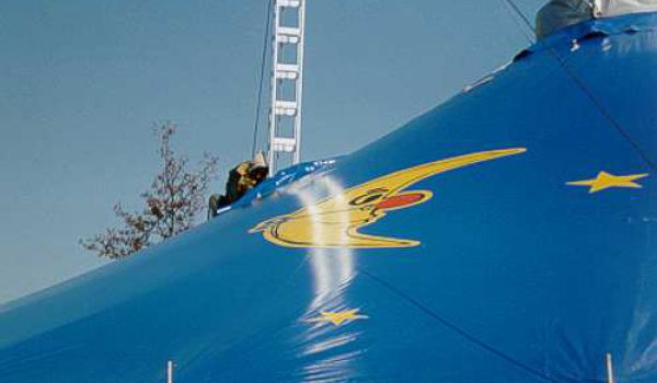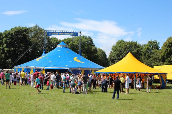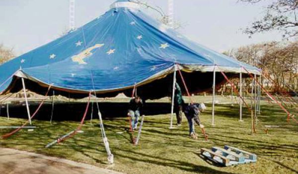 Kein Zirkus ohne Zelt. Und so reist der Tausendtraum mit seinem blau – gelben Sternenzelt an jede Schule.